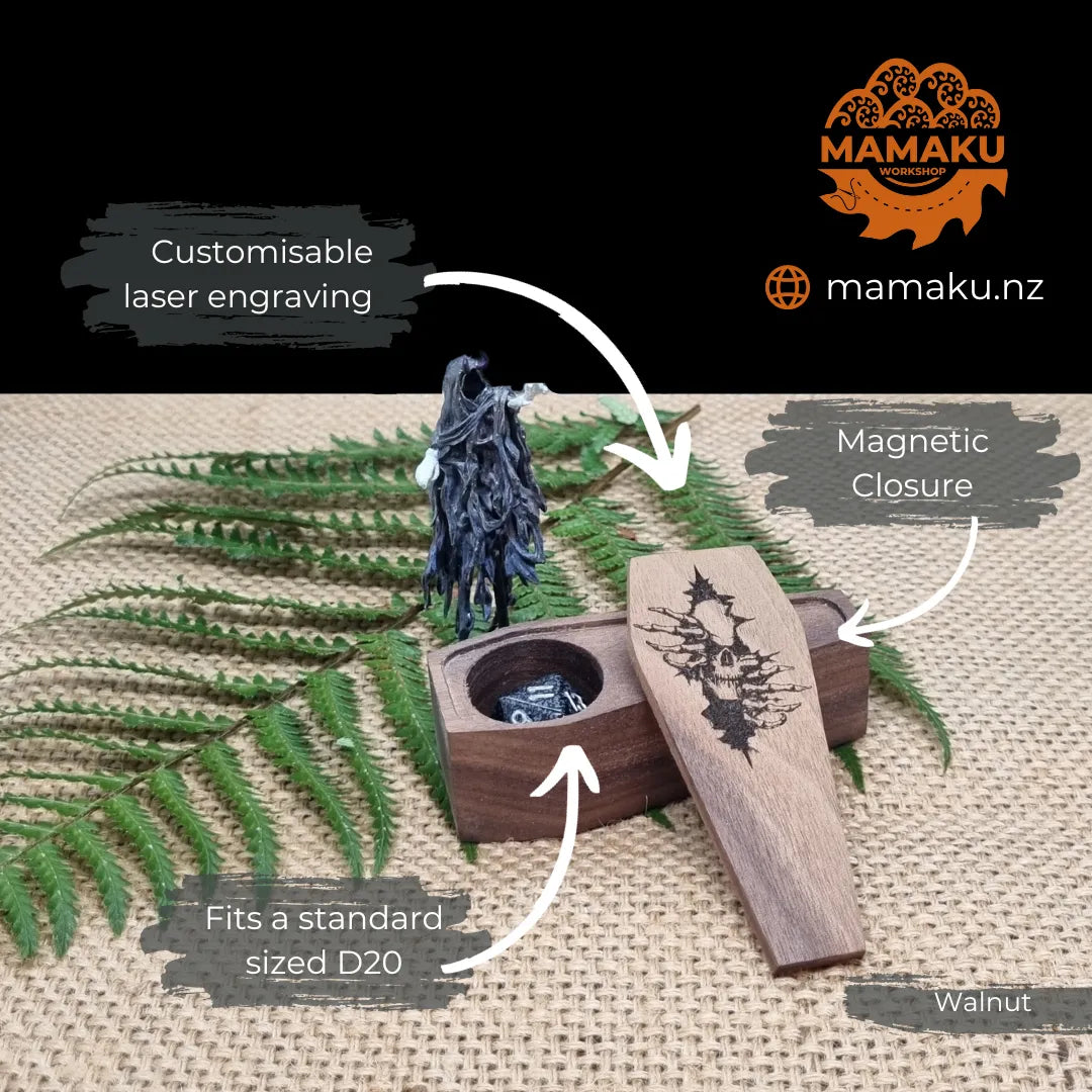 Add an extra personal touch by having the lid of your Death Save Dice Coffin laser engraved! These Dice Coffins take a single D20 reserved just for death saves, creating a real sense of dread when handed over to a player for their death saving throws.