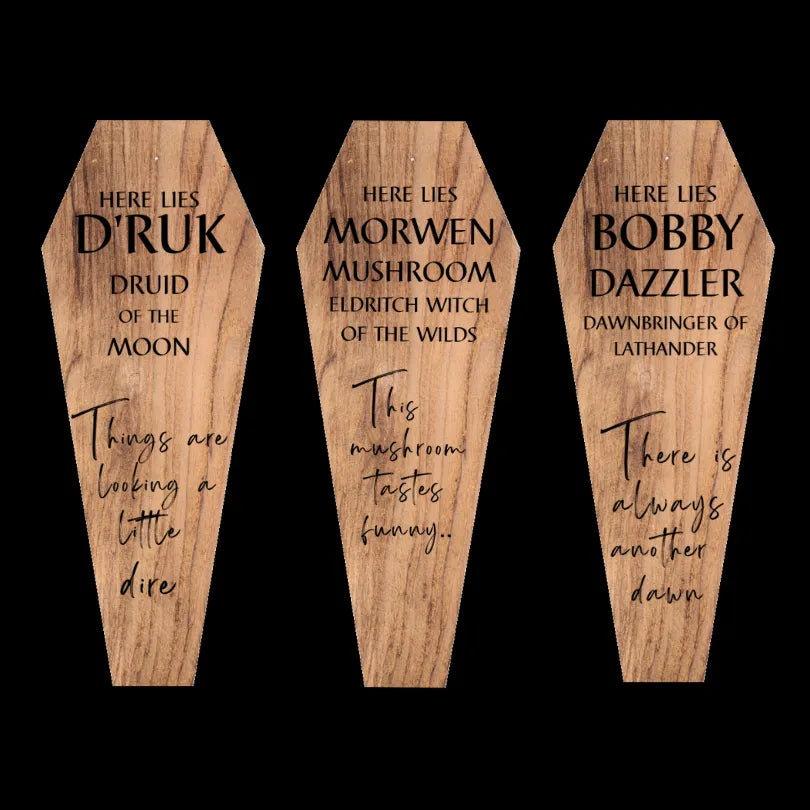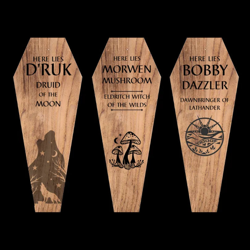 Are you running a campaign and want to have a personalised experience for your players? We can make a set of lids for your dice coffin engraved with each of your players' names. There's nothing quite like handing your players their death save dice in a tiny coffin with their name on it to make them feel the tension! You also have a great memento for any players who fall in battle. This set provides one coffin with multiple lids.